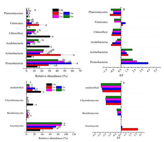 基于此,采用13C标记葡萄糖为底物进行土壤模拟培养并定期取样,利用稳定同位素核酸探针(DNA-SIP)和高通量测序技术探讨真菌和细菌利用葡萄糖来源碳的动态特征。研究发现,从细菌向真菌演替的r-k策略决定了微生物群落对葡萄糖的动态利用特征。在细菌群落中,隶属于富营养菌的变形菌门和放线菌门对活性底物的利用能力显著高于寡营养菌的酸杆菌门和绿弯菌门。葡萄糖的不断加入并未改变不同营养类型细菌的底物利用策略。和细菌的底物利用策略显著不同,真菌子囊菌门和担子菌门均可以利用葡萄糖和土壤原有组分,表明真菌对底物的利用具有广谱性特征,并且活性底物可诱导真菌对土壤原有组分的利用。