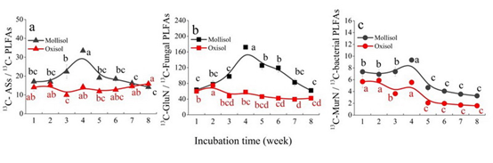 在此基础上,进一步利用磷脂脂肪酸同位素探针技术(PLFA-SIP)和氨基糖同位素探针技术(AS-SIP)相结合来评估微生物从底物利用策略到增殖-死亡过程对土壤有机碳积累的驱动作用。我们发现,低有机质的红壤对外源葡萄糖碳响应较快,并通过较高的代谢能力和真菌残留物的积累保持外源活性碳固持能力;而有机质较高的黑土中微生物对外源活性碳响应不敏感,但可通过微生物量周转保持较高的微生物残体积累效率,从而控制外源活性碳在黑土中的积累。因此,微生物对外源底物的响应以及微生物从增殖到死亡的周转以及微生物残留物的积累和稳定化共同控制着土壤碳截获过程。研究成果对明确微生物底物利用和周转对土壤有机碳形成的驱动机制具有重要的理论意义。