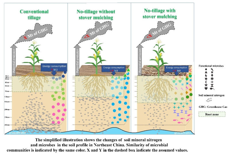 上述结果以“Low-disturbance framing regenerates healthy deep soil toward sustainable agriculture – evidence from long-term no-tillage with stover mulching in Molisols”和“Fungi determine increased soil organic carbon more than bacteria through their necromass inputs in conservation tillage croplands”为题分别发表在2022年的Science of the Total Environment和Soil Biology and Biochemistry杂志上。生态系统微生物学组博士研究生邓芳博和杨雅丽分别为第一作者,梁超研究员为通讯作者,解宏图、鲍雪莲、何红波、张旭东研究员等为共同作者。研究得到了国家重点研发计划项目、国家自然科学基金重点项目、面上项目和王宽诚率先人才计划卢嘉锡国际团队等项目的资助。 耕作方式对矿质氮和微生物群落影响的模式图