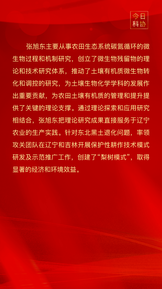 张旭东研究员从事保护性耕作研发、优化和推广工作10余年。他针对黑土地退化问题,建立了我国东北地区首个保护性耕作研发基地(中国科学院沈阳应用生态研究所保护性耕作研发基地),创新发展了“梨树模式”。2019年,胡春华副总理曾先后两次视察保护性耕作研发成果,张旭东研究员团队的工作得到了高度认可,大力推动了国家《东北黑土地保护性耕作行动计划(2020—2025年)》的制定和实施。