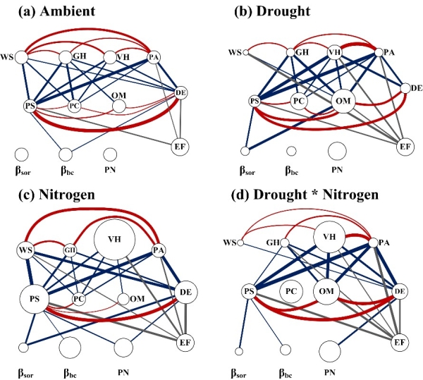 为此,中国科学院沈阳应用生态研究所生态化学计量组研究团队,依托额尔古纳站全球变化多因子试验平台,探讨了我国温带草原节肢动物相互作用网络对氮添加、干旱、延迟融雪的响应。结果表明,氮添加和干旱通过不同方式降低了节肢动物相互作用网络的复杂性(图1),其中氮添加是通过增加植物氮含量和降低植物多样性,而干旱则是通过改变微生境和过滤植物物种(图2)。积雪融化时间的延迟仅对生长季初期的节肢动物丰度产生了显著的促进作用,但是它与氮添加和干旱的相互作用在生长旺季对结网蜘蛛和地面游猎者两个捕食者类群产生了不同的影响,即增加了前者的丰度而降低了后者的多样性。综上所述,植物物种多样性下降和植物组织氮浓度的增加是全球变化导致生态网络简单化的关键机制,如果再伴随着微生境的变化,节肢动物网络的简单化过程会被进一步加强。此外,我们强调不同的全球变化因子往往存在交互作用,即使它们发生在不同季节,所以在全球变化研究中,要同时全面考察多种因子的共同作用,才有可能得到全球变化影响的全貌。