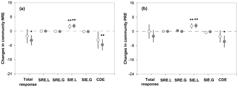 研究结果显示,两种类型的极端干旱均导致植物群落组成发生明显变化,且显著降低多数存留物种的养分回收效率,却并没有改变群落水平的养分回收效率。在干旱过程中所丢失的物种,通常具有比其他物种更低的养分回收效率,因此它们的消失对于群落水平养分回收的变化具有正向贡献,即低回收效率物种的消失后群落平均回收效率与不进行干旱处理的对照群落相比得以提高。这种正向贡献能够抵消干旱对于存留物种养分回收效率的负面影响。