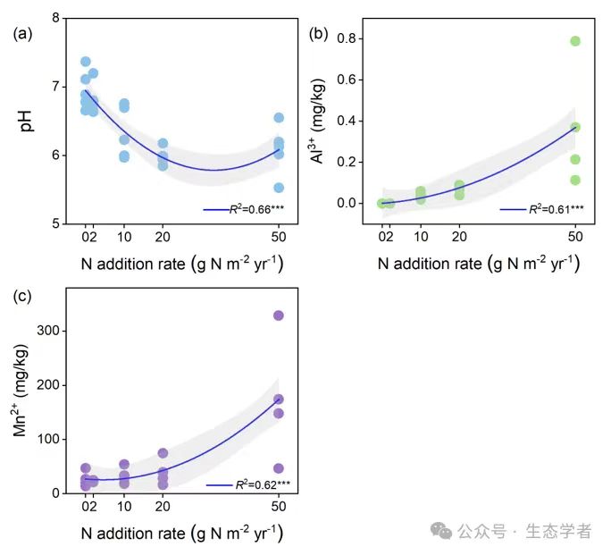 图3 野外控制实验中氮添加速率对土壤 pH 值(a)、Al3+(b)和 Mn2+(c)含量的影响(n = 25)。R2值表示调整后的R方。统计显著性用***p < 0.001表示。