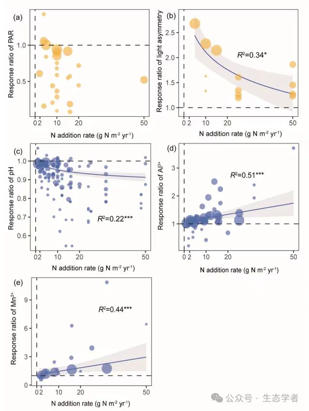 图5 Meta分析中光合有效辐射(PAR)(a)、光照不对称性(b)、pH 值(c)、Al3+(d)和 Mn2+(e)的响应比与氮添加速率之间的关系。响应比的计算方法是:氮添加处理的数值除以对照处理的数值。图中圆圈的大小反映了方差的倒数,回归线是通过指数拟合模型和95%的置信区间生成的。只有存在显著关系(p < 0.05)时,图中才会出现回归线。黄色点代表与光竞争机制相关的数据,蓝色点对应与离子毒害机制相关的数据。R2值表示调整后的R方。统计显著性如下:*p < 0.05; ***p < 0.001。