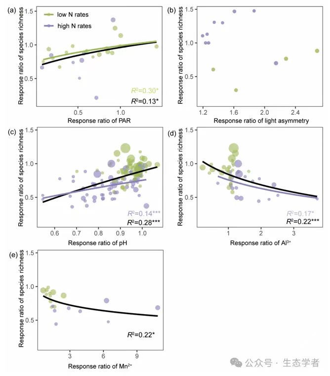 图6 Meta分析中物种丰富度响应比与光合有效辐射(PAR)(a)、光照不对称性(b)、pH 值(c)、Al3+(d)和 Mn2+(e)等变量之间的关系。响应比的计算方法是:氮添加处理的数值除以对照处理的数值。图中圆圈的大小代表方差的倒数,圆圈和回归线的颜色对应不同的氮添加速率(绿色代表低氮添加速率,紫色代表高氮添加速率)。黑线代表在不同氮添加率下观察到的整体关系。当发现有显著关系时(p < 0.05),回归线就会出现。R2值表示调整后的R方。统计意义表示如下:*p < 0.05;***p < 0.001。