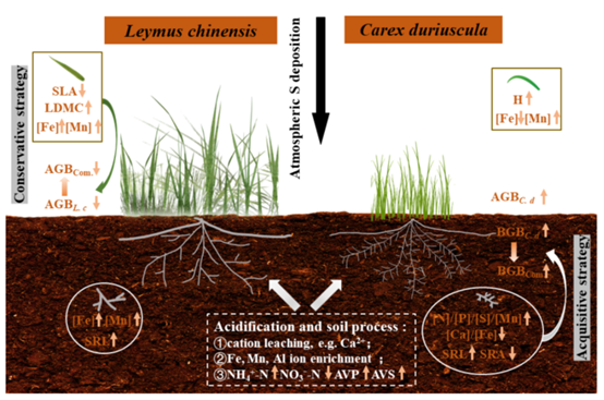 大气硫沉降及其导致的土壤酸化对陆地生态系统生物多样性和生态功能具有重要影响。土壤酸化导致草原生态系统生物多样性降低,并通过影响土壤养分有效性直接或间接影响植物地上和地下生物量,然而人们对土壤酸化如何通过改变草原植物叶和根的功能性状,进而影响植物地上和地下生物量,尚缺乏系统研究。