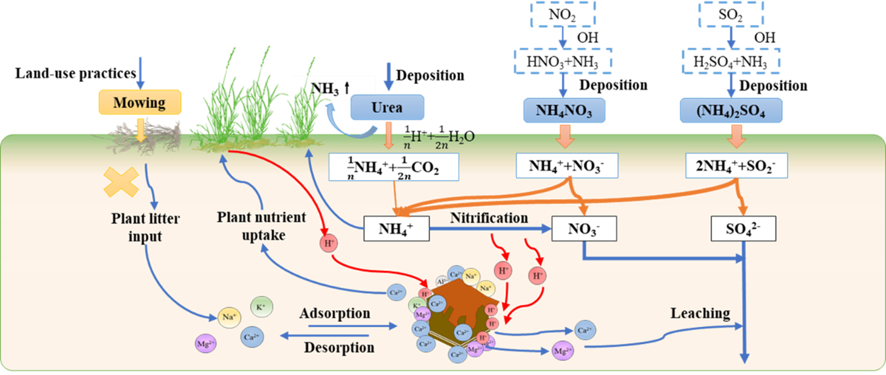 土壤具有缓冲性能,有助于缓和土壤酸碱变化,为植物生长和微生物活动创造比较稳定的生活环境。土壤缓冲性能(Soil buffering cpapacity)主要通过土壤胶体的离子交换作用、强碱弱酸盐的解离等过程来实现,因此土壤缓冲性能的高低取决于土壤胶体的类型与总量、土壤中碳酸盐、重碳酸盐、硅酸盐、磷酸盐和磷酸氢盐的含量等。量化土壤酸缓冲性能的一个重要指标是土壤酸中和能力(Acid neutralizing capacity, ANC),ANC是土壤体系在某一参比pH下所能中和的强酸的量。活性氮输入导致的土壤酸化已成为草原生态系统的一个主要环境问题,酸化降低土壤的酸性中和能力,可能改变土壤团聚体组成和分布、离子组成,影响土壤-植物系统养分和水分循环。草地管理实践,如割草和放牧,可以输出大量的氮及其他营养元素,如盐性离子的输出会加剧土壤酸化。然而,关于不同形态氮化合物添加和割草对土壤ANC变化的影响及驱动机制的尚缺乏系统研究。