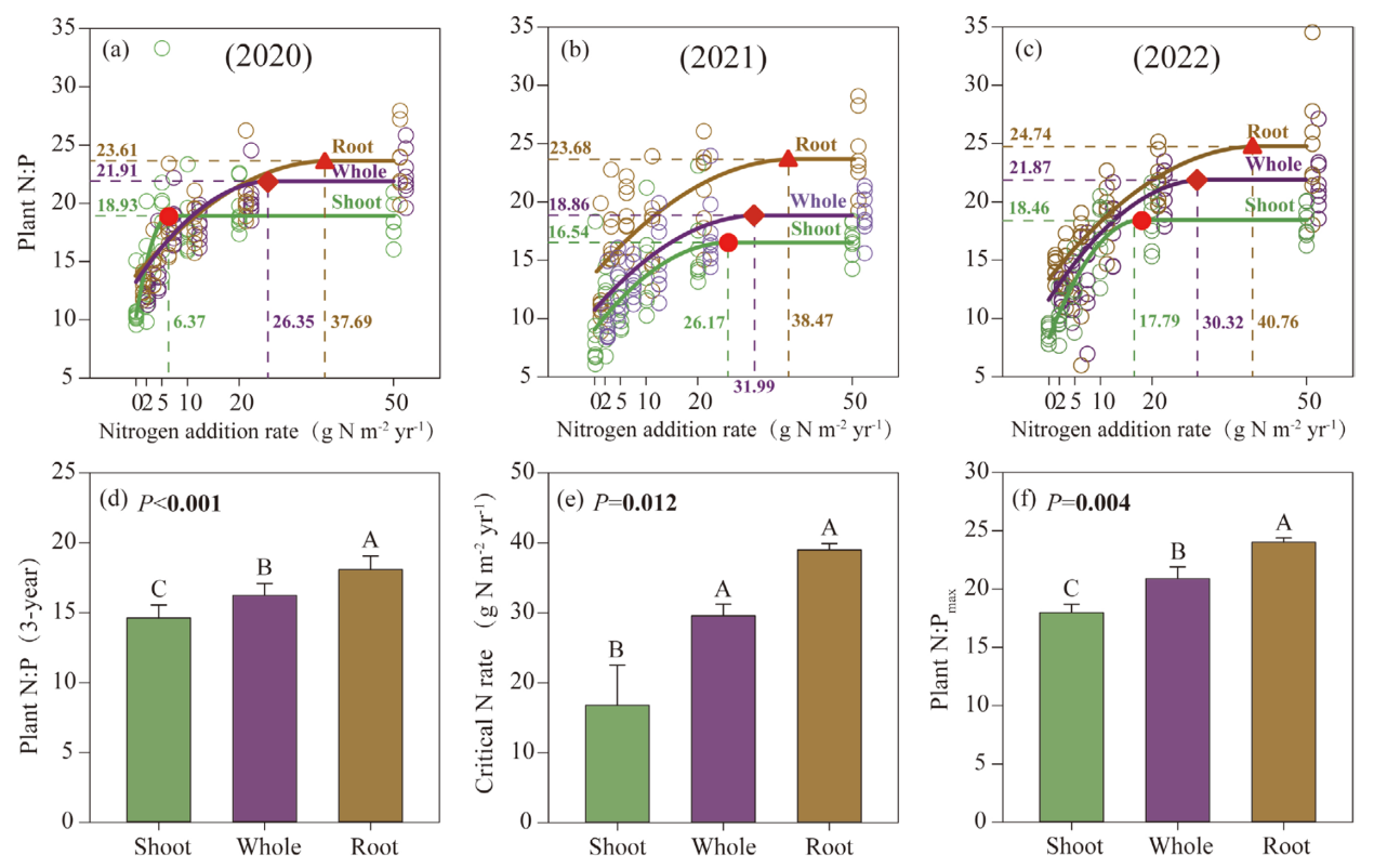 基于此,吕晓涛研究员等人依托本站的氮素化合物长期添加实验平台,系统探讨了草甸草原植物地上-地下器官N:P对氮素富集的响应特征。研究发现:植物地上器官和根系N:P均随氮素输入量呈非线性变化(图1),主要由各器官氮浓度的非线性响应驱动;根系N:P显著高于地上器官,且其氮饱和阈值(NCR=39.0 g N m-² yr-¹)为地上部分阈值(NCR=16.8 g N m-² yr⁻¹)的2.3倍;根系N:P内稳性指数(H=6.25)低于地上部分(H=6.58),表明根系的N:P稳态维持能力更低。上述结果表明仅基于地上器官的传统研究可能低估了氮素富集引发的植物氮磷失衡程度。植物根系氮磷化学计量特征对氮素输入的响应与地上器官存在明显差别,这一点应该在生物地球化学循环模型中予以考虑。