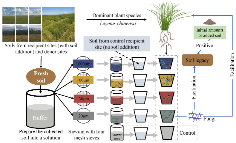 该研究强调了土壤接种量和小型土壤生物在土壤遗留效应中的重要性。表明植物与土壤生物之间的相互作用是恢复退化生态系统不可忽视的关键因素。研究成果以“Small-sized soil organisms drive the legacy of soil addition in a degraded grassland”为题于2025年4月发表在Functional Ecology期刊上。中国科学院沈阳应用生态研究所已毕业博士李玉辉为第一作者,博士生孙翌昕为共同第一作者,李琪研究员为通讯作者。该研究得到了中国科学院国际伙伴计划、国家自然科学基金等项目资助。