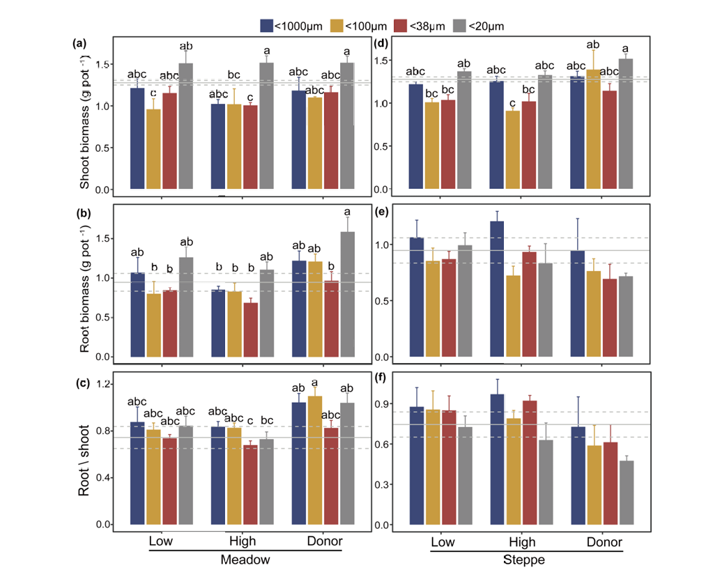针对这一科学问题,研究团队依托额尔古纳站土壤接种的野外试验平台,采集土壤进行了土壤接种遗留效应的微观模拟实验,进一步评估植物-土壤互作机制。研究发现,在退化草地上进行土壤接种4年后,土壤接种的遗留效应仍会影响土壤微生物群落组成和植物生长。小型土壤生物(< 20 μm),特别是土壤真菌,对遗留效应的形成和植物生长更为重要。