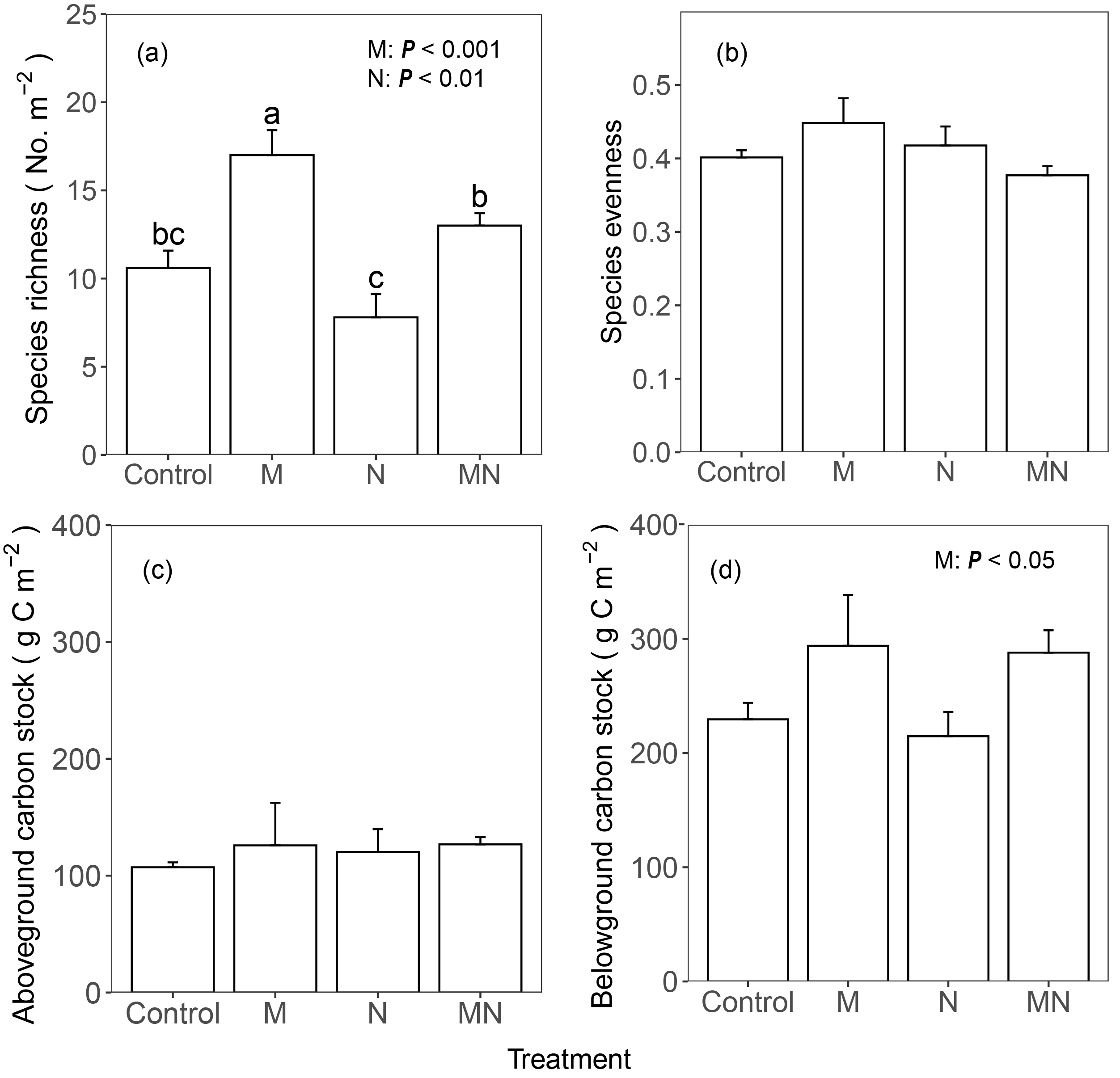 图1刈割和氮添加对物种丰富度、均匀度、群落地上和地下碳储量的影响。