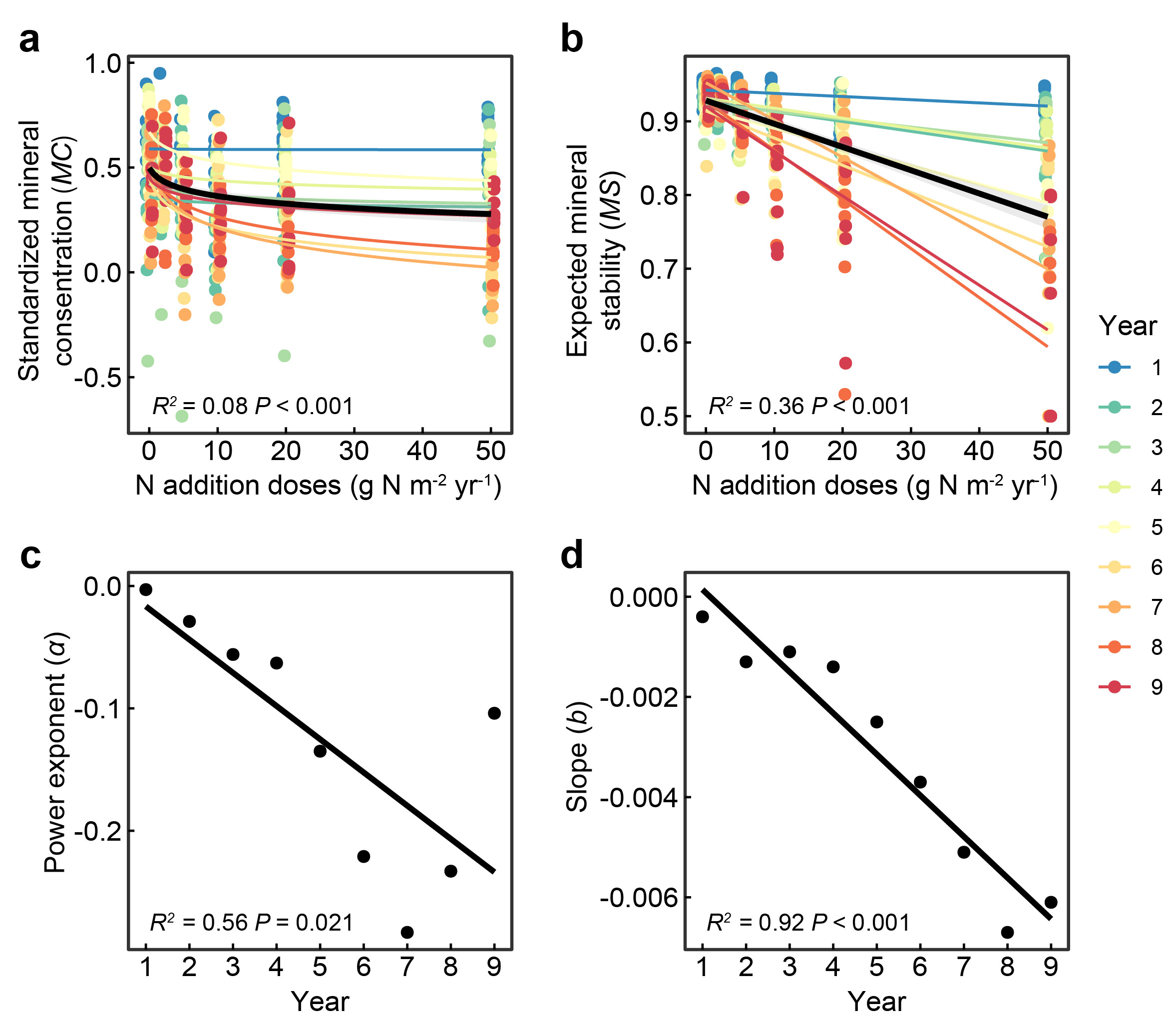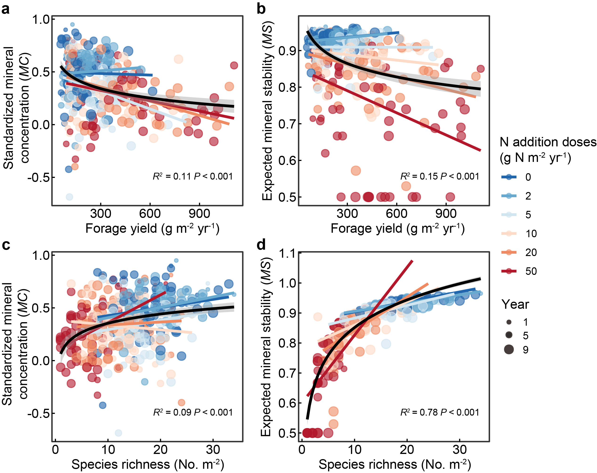 图2 氮素补给梯度上牧草产量和物种丰富度与牧草标准化非氮矿质养分含量(a、c)和预期养分稳定性(b、d)之间的关系