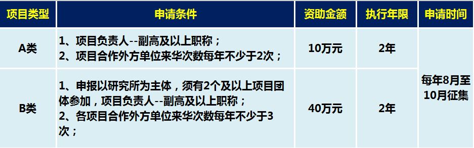 (二)特别交流计划B类:申报应以中国科学院院属研究机构或大学为单位,有2个及以上项目团队参加,项目负责人应为具有副高及以上职称的在职科研人员;各项目外方合作单位人员每年应至少来华3次。