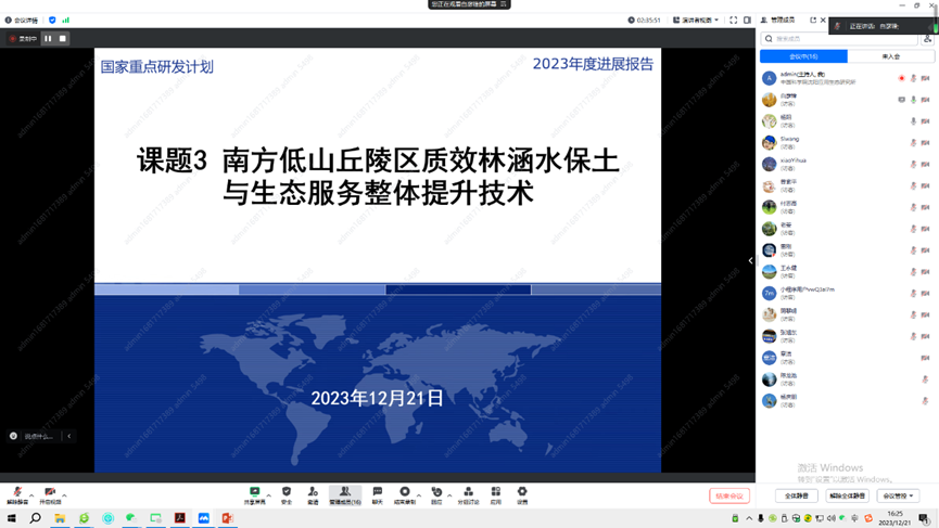 2023年12月21日,由中国科学院沈阳应用生态研究所主持的“十四五”国家重点研发计划课题“南方低山丘陵区低质低效林涵水保土与生态服务整体提升技术”2023年度总结会议通过腾讯会议召开。会议由课题负责人张伟东主持。项目组管理人员、课题负责人、专题负责人及主要学术骨干等16人参加了会议。