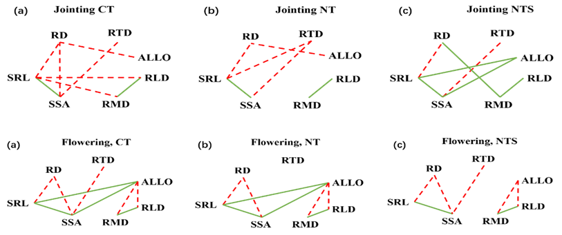 为此,中国科学院沈阳应用生态研究所土壤健康维持机制与生物调控大团队地下生态过程组依托梨树保护性耕作研发平台,发现玉米侧根性状在不同生育期对土壤健康状况做出不同程度的响应。总得来说,比根长、直径和根长密度具有明显的可塑性,变幅达-22%~20%,且在不同生育期表现出截然不同的变化方向。随着作物生长,比根长与直径截然相反的可塑性变化以及侧根性状间的相关性变弱反映了玉米根系对土壤养分资源获取策略的转变。在拔节期,显著的生物量分配与比根长正相关关系表明在免耕全量秸秆覆盖处理下玉米更多依赖侧根生长获取土壤资源。相反,在开花期,免耕全量秸秆覆盖处理显著增加侧根直径并降低比根长,表明此时期玉米更多依赖丛枝菌根菌丝通道获取土壤资源。这种资源获取方式的互补效应是玉米全生育期养分高效利用和黑土健康维持的重要保证。