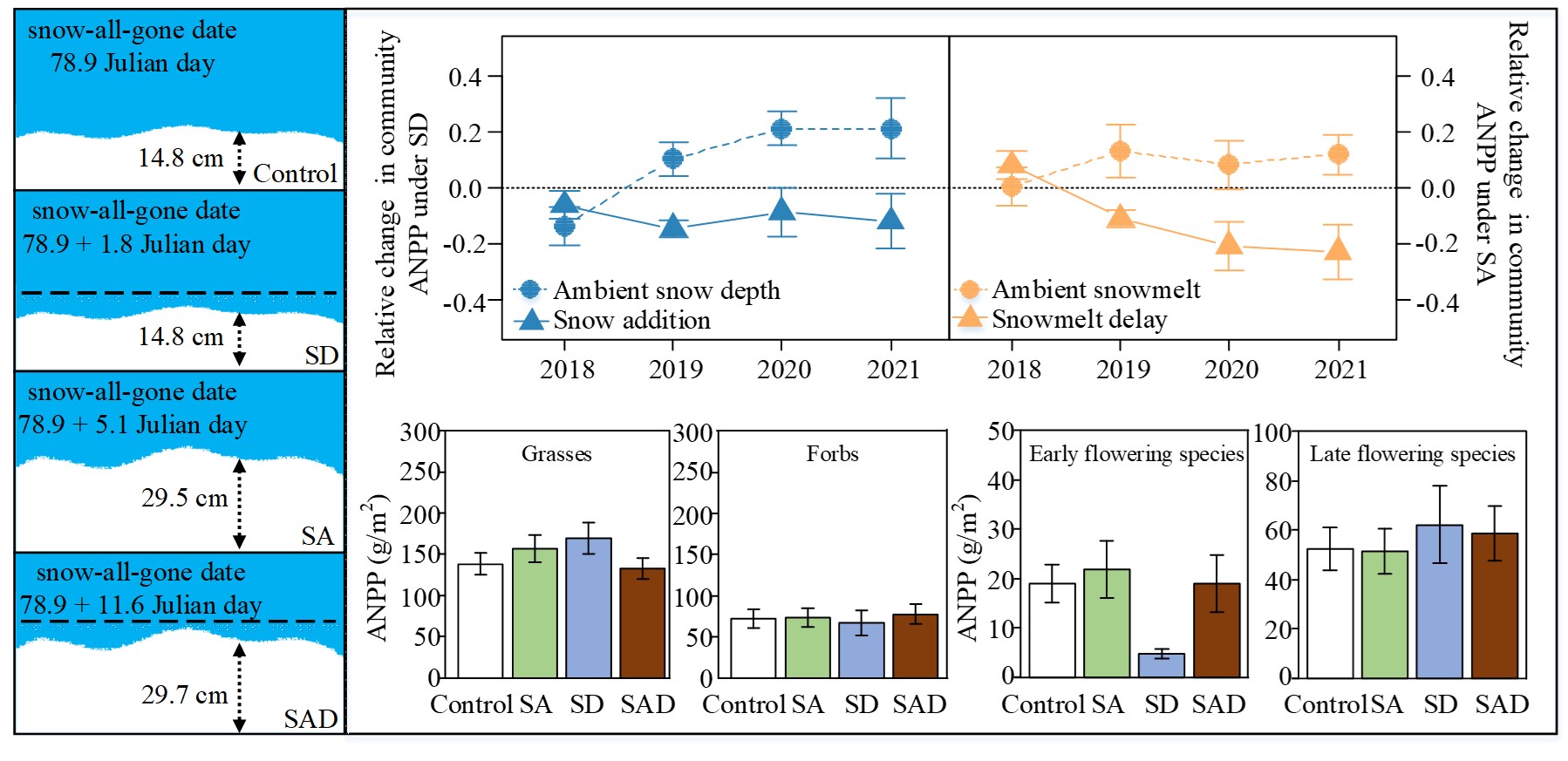 基于此,中国科学院沈阳应用生态研究所生态化学计量学团队依托额尔古纳森林草原过渡带生态系统研究站建立的积雪控制实验平台,通过4年积雪厚度倍增、融化时间延迟及其叠加处理,评估了积雪深度和融雪时间对地上净初级生产力和群落物种组成的影响及其潜在机制。研究发现,单独增雪对植物群落组成和地上净初级生产力无影响,而单独融雪延迟推迟了植物物候,增加了地上净初级生产力,降低了物种多样性且改变了群落的物种组成。其中,禾本科植物的敏感性高于杂类草植物、早花杂类草植物的敏感性高于晚花杂类草植物。积雪厚度倍增与融化时间延迟存在显著交互作用。在融雪延迟条件下,增加积雪厚度进一步推迟,实际上是过度推迟了积雪消融时间,从而抵消了积雪延迟处理对地上净初级生产力和物种多样性的积极影响。该研究强调了积雪融化时间对季节性积雪覆盖的草地生态系统结构和功能的重要性,加深了人们对积雪生态作用及积雪变化生态后果的认知。
