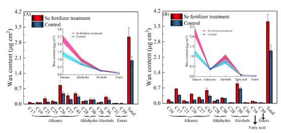 通过在辽宁省和吉林省的五个地区对水稻进行富硒叶面肥的施用,团队评估了其对水稻品质、叶片形态和蜡质特性的改善效果。研究发现,富硒肥能够通过增加叶片表面的润湿性和蜡质层的厚度,提高水稻对硒的吸收效率,减少叶片水分的流失,从而有效地提升稻米的硒含量及整体品质。这一研究成果2024年发表在《Journal of Plant Nutrition》上,论文题为“Increased nutritional quality of rice grains and migration mechanisms of selenium by spraying a foliar selenium-rich nutrient solution”,其中特别研究助理张晓蓉为第一作者,巩宗强研究员为通讯作者。