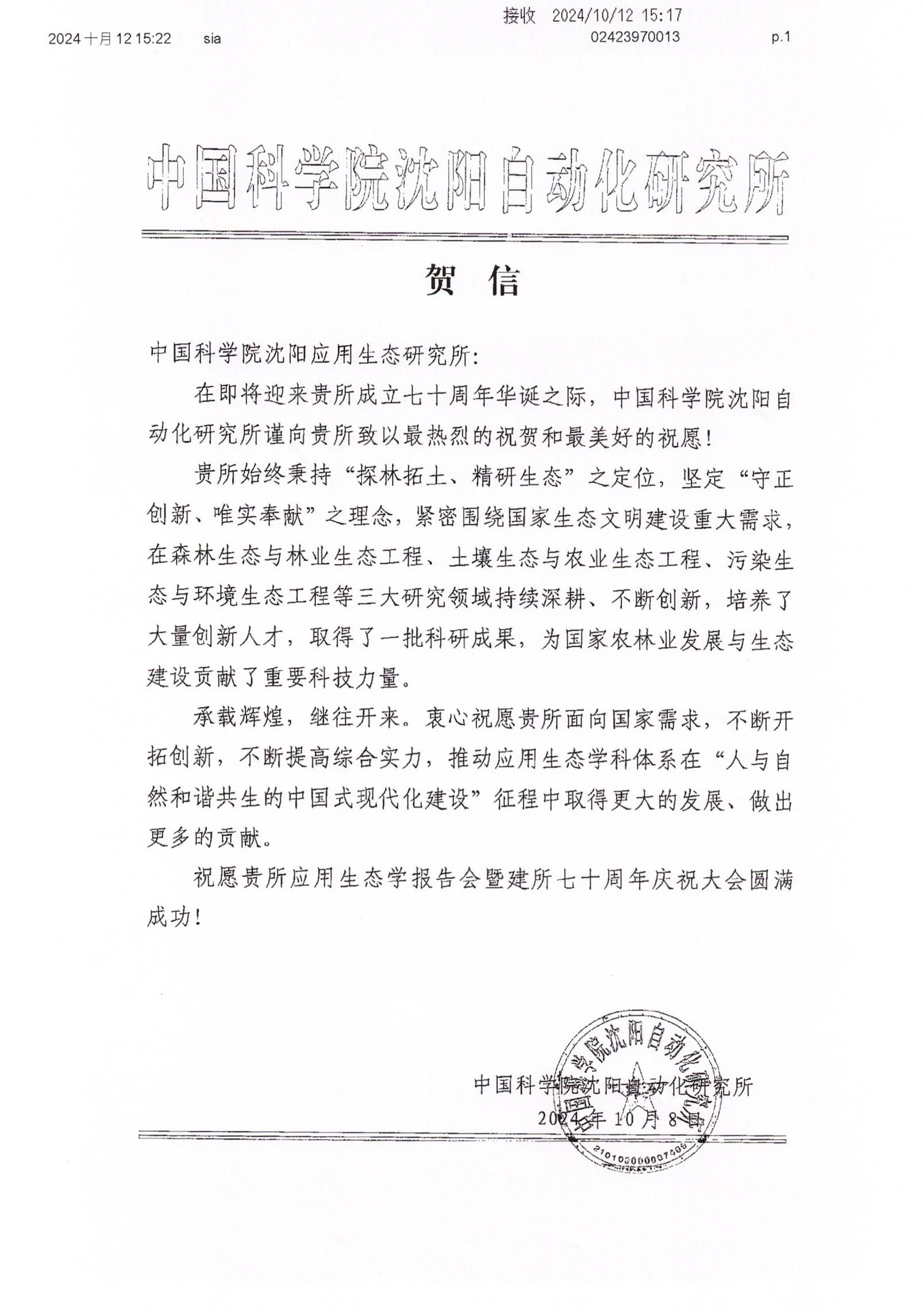 贺信--中国科学院沈阳自动化研究所