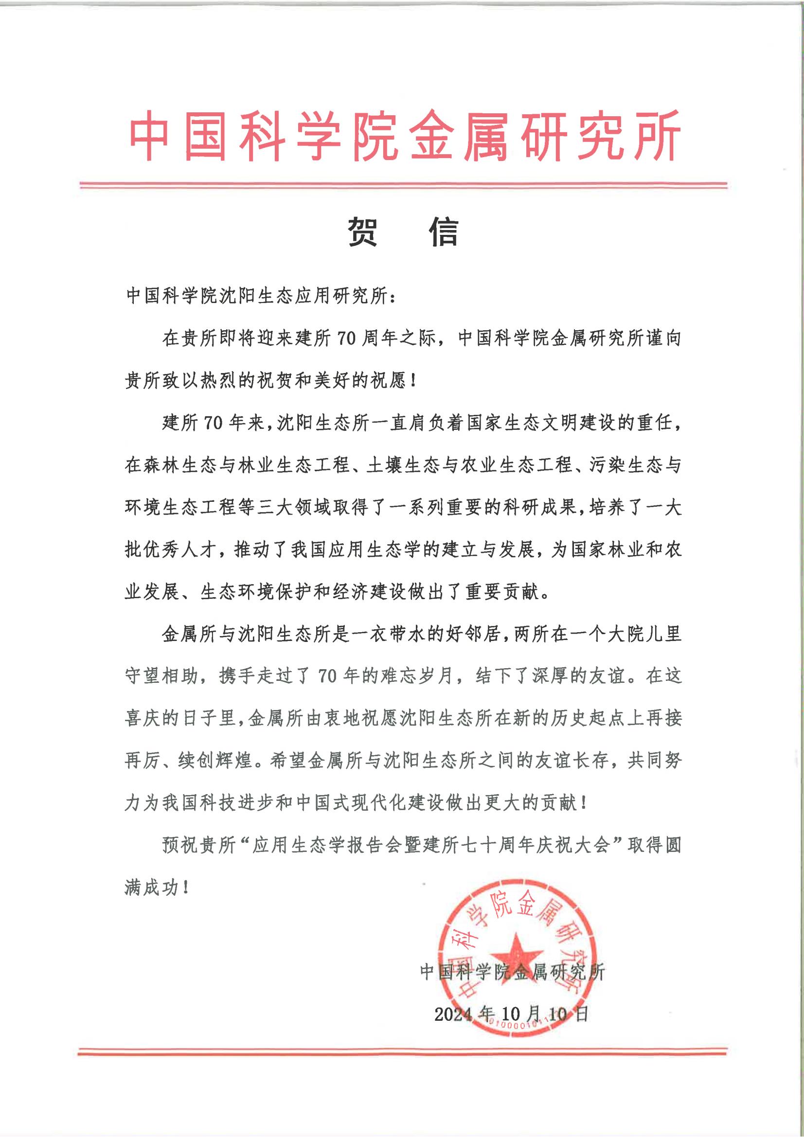 贺信--中国科学院金属研究所