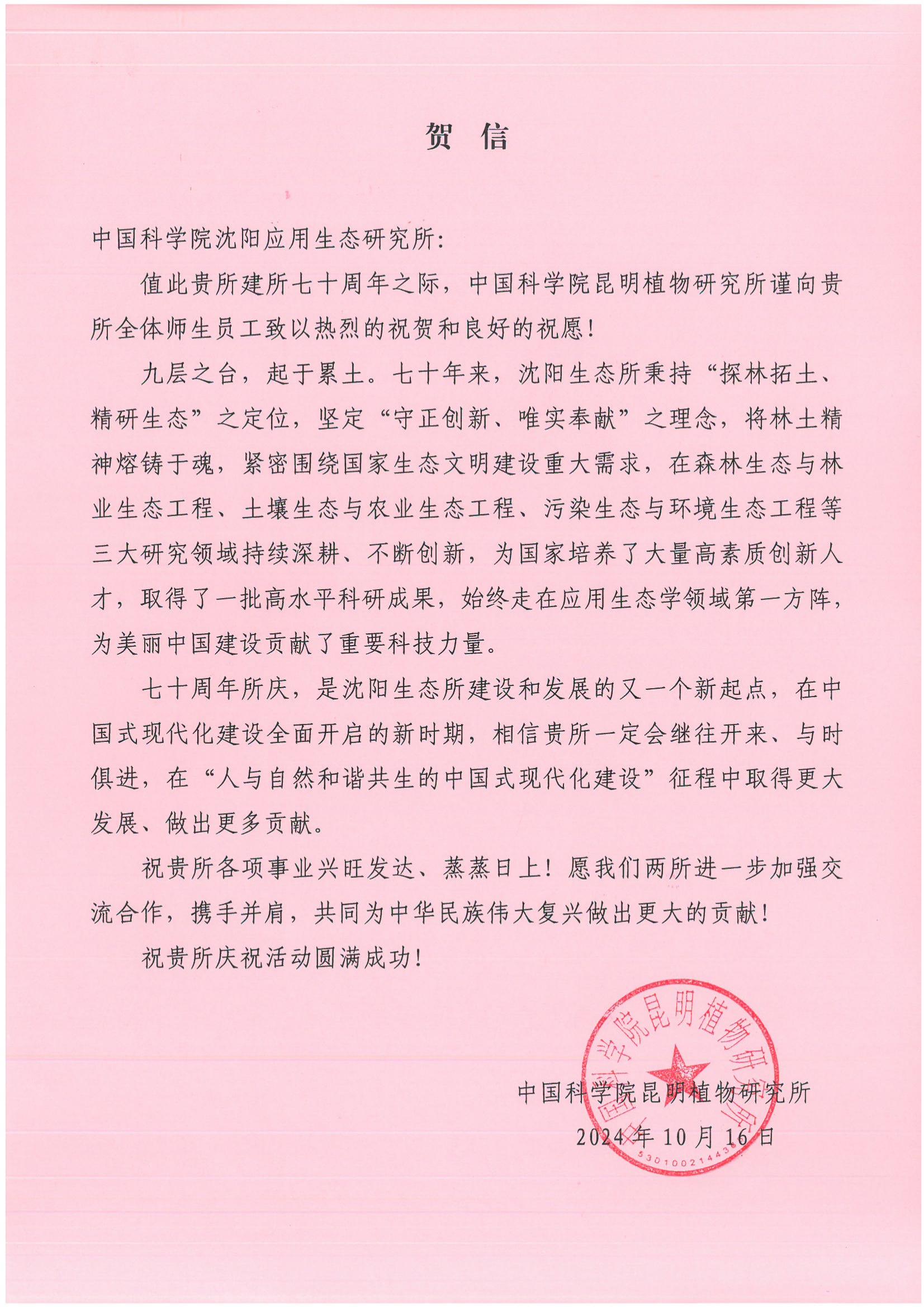贺信--中国科学院昆明植物研究所