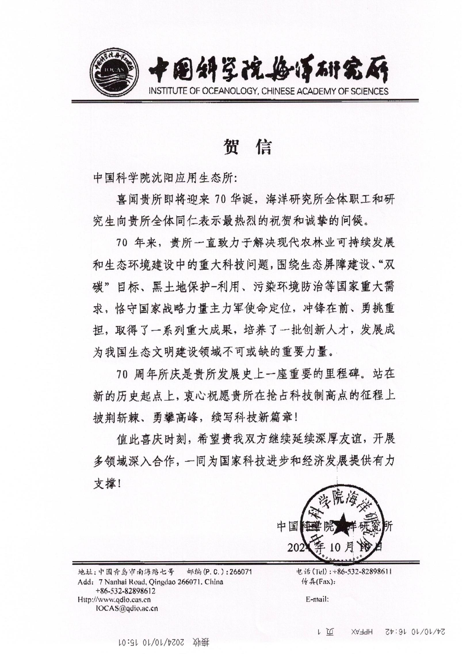 贺信--中国科学院海洋研究所