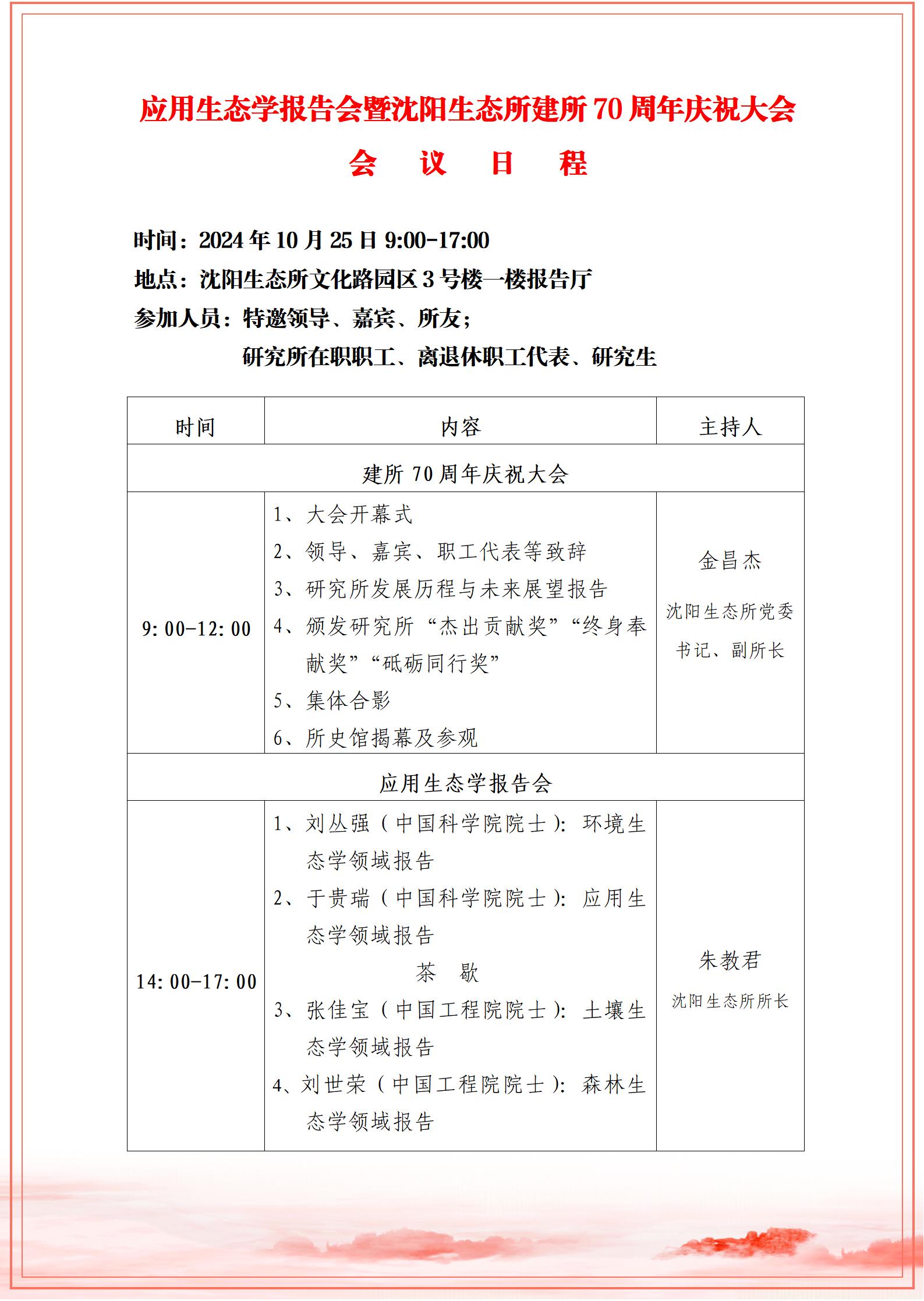 应用生态学报告会暨沈阳生态所建所70周年庆祝大会会议日程