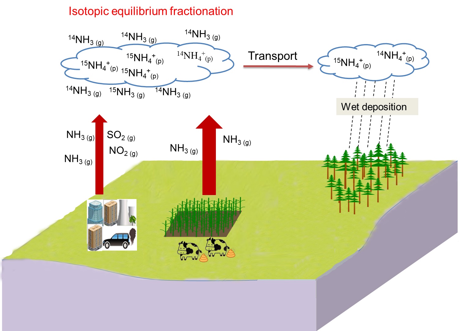 工业革命以来,人类活动向大气层排放的含氮化合物急剧增加,从而使大气氮沉降量随之急剧上升。过量氮沉降会对陆地生态系统产生一系列的影响,比如引起土壤酸化和养分失衡,水体富营养化,生物多样性降低等。大气氮沉降主要来自大气氨和氮氧化物排放。此外,大气沉降前体物质氨和氮氧化物在大气雾霾的形成中也扮演重要角色。中国是全球大气氮沉降严重的区域之一,为了减少大气氮沉降的不利影响,我国自“十二五”以来制定了氮氧化物减排的政策并实施氮氧化物总量控制,但是并未针对大气氨排放制定相应的减排政策。为了更好地制定大气氨减排的政策,了解大气铵沉降的氨源是十分重要的前提。近年稳定同位素测定技术的迅速发展使得氮同位素自然丰度来解析大气氨源成为可能。然而,过去诸多相关研究主要集中在氮污染严重区域(城市和农业区域),在偏远相对洁净的地区研究少。而且,同位素源解析的研究往往忽略了铵盐形成过程中的分馏作用(图1)。