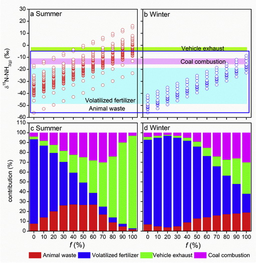 图3. 夏季(a.c)和冬季(b.d)大气氨15N同位素特征及不同氨源贡献