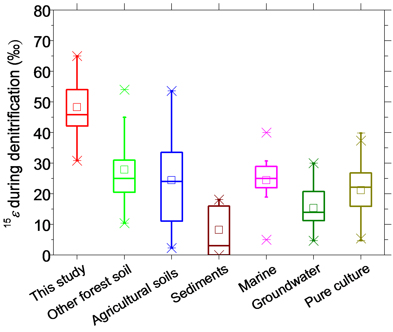 图2 森林土壤反硝化作用N同位素分馏系数月其他环境下反硝化作用分馏系数比较(15ε)