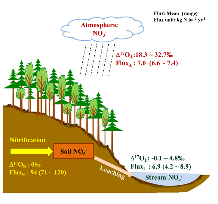 过去半个世纪以来,人类活动向大气释放的活性气态氮急剧增加,从而导致了陆地生态系统氮沉降也随之增加。绝大多数森林植物生产力受氮供应限制。因此,氮沉降一定程度上会促进森林树木生长,但长期过量的氮沉降则会对森林生态系统产生不利影响,导致土壤酸化、养分流失、植物养分失衡、温室气体排放增加和生物多样性损失。硝化作用是微生物将铵态氮或可溶性有机氮转化为硝态氮的过程。铵态氮和硝态氮均是植物和微生物利用的主要氮形态,但硝态氮易于发生淋溶进入下游水体,从而引起土壤盐基养分的损失和下游水体的富营养化。硝态氮是反硝化作用(硝态氮逐步还原成氮气的过程)的底物,过多的硝态氮会增加反硝化作用的发生。硝化和反硝化作用是产生温室气体N2O的重要微生物途径。因此,硝化作用影响森林氮的有效性和组成,是生态系统氮循环过程关键环节之一。此外,集水区尺度上量化土壤硝化作用速率是量化反硝化作用速率的必要步骤之一(Fang et al. 2015. PNAS)。但由于森林土壤硝化作用的时空异质性,在生态系统尺度上量化硝化作用速率的问题一直难以解决。