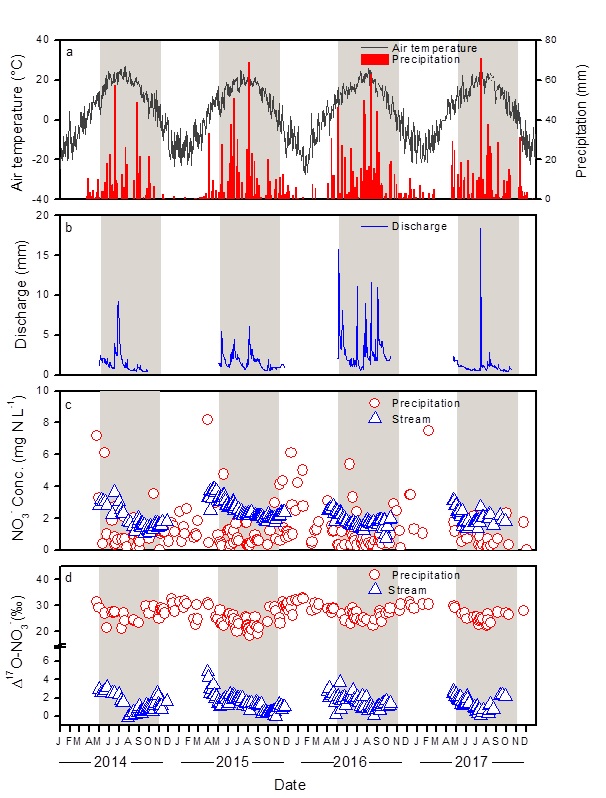 图2. 清原温带森林2014~2017年日平均气温和日降水量(a)、日径流量(b)、大气降水和溪水硝酸盐含量(c)、17O盈余(d)
