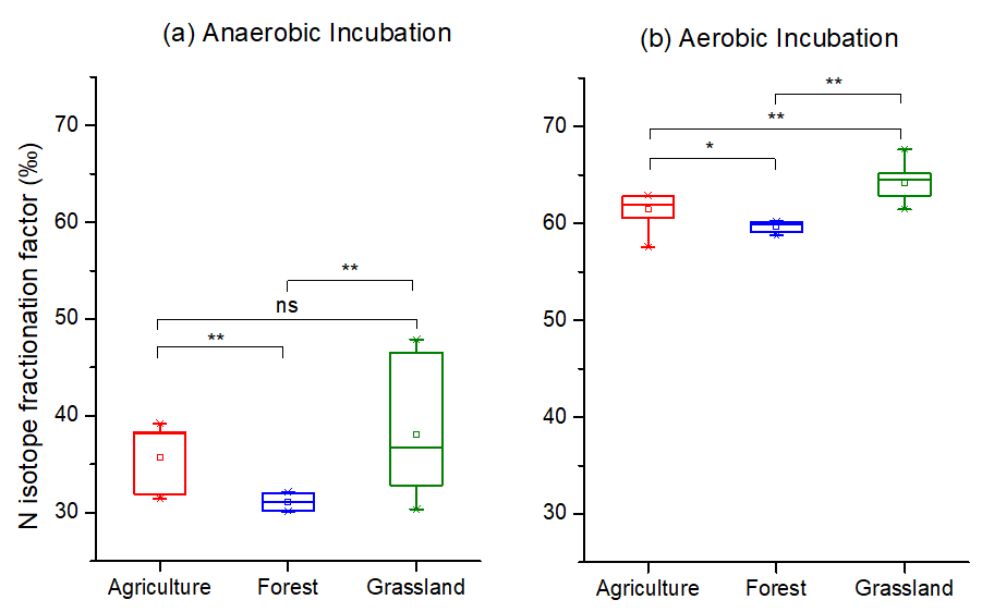中国科学院沈阳应用生态研究所稳定性同位素生态学研究团队,采集了中国北方三种生态系统类型共七个站点的土壤样品(两个农田土,两个森林土和三个草地土壤),进行了室内控制培养实验, 分别测定其在有氧和厌氧条件下产生的NO及底物硝态氮和铵态氮氮同位素组成的变化,并探讨了硝化和反硝化作用产生NO过程中的同位素分馏作用。研究结果发现,有氧条件(硝化作用占主导)土壤产生的δ15N-NO(-56 ± 4‰)显著低于厌氧条件(反硝化作用主导)产生的δ15N-NO(-33 ± 7‰,图1)。此外,不同生态系统类型土壤均表现为有氧过程产生NO的分馏系数(61 ± 3‰)显著大于厌氧过程产生的分馏系数(35 ± 6‰,图2)。因此,可以根据土壤产生的δ15N-NO值来区分硝化和反硝化作用对土壤NO产生的相对贡献,为建立N循环模型提供理论基础。我们还发现,土壤产生的δ15N-NO值(-62 ~ -23‰)显著低于生物质和化石燃料燃烧产生的δ15N-NO(0 ~ + 20‰,图1)。因此,利用氮稳定同位素技术可以有效区分土壤和人为源对大气NO的贡献。