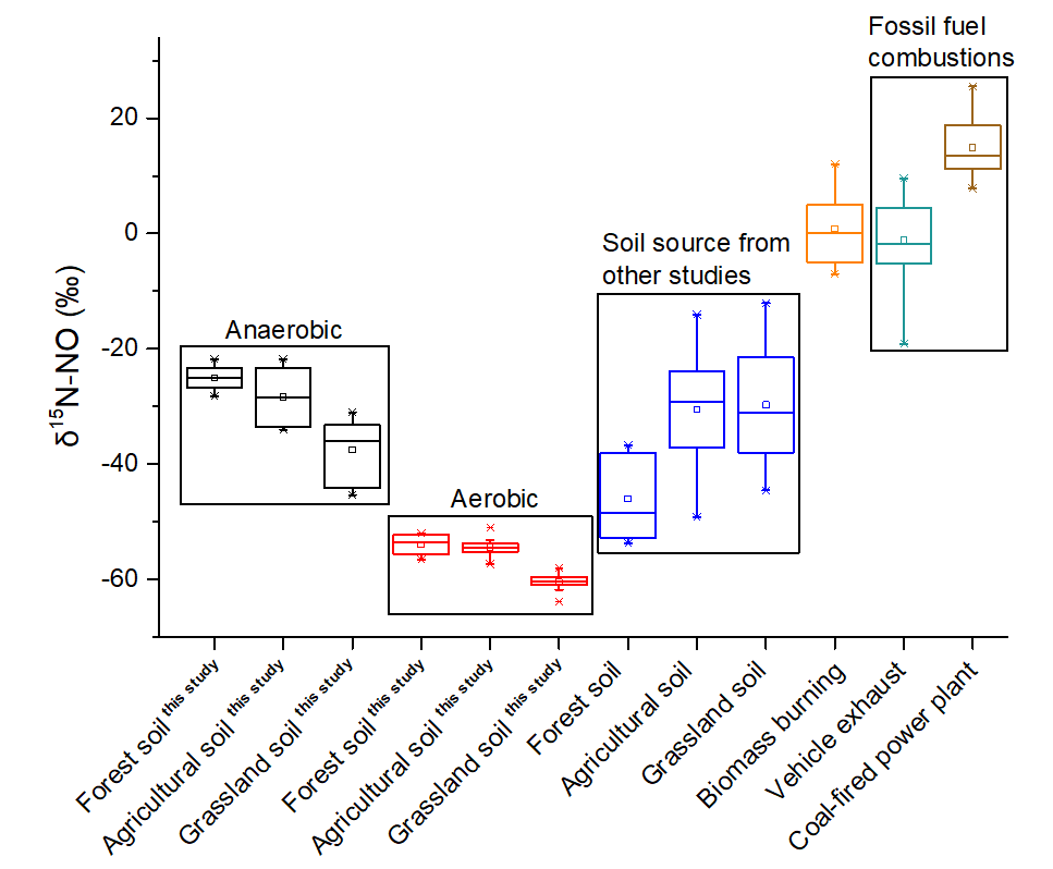 大气灰霾问题越来越受到人们的关注,不仅污染生态环境,而且严重威胁人类健康。硝酸盐是灰霾的主要组成成分,其前提物一氧化氮(NO)排放的不断增加,是加重灰霾问题的主要原因之一。NO不仅影响空气质量,还控制着臭氧的产生进而影响大气的氧化能力,在大气化学中起重要作用。为了减少环境污染,解析NO的排放源和减少其排放量,成为当今研究的重要任务。近年来,氮稳定同位素( δ15N)技术逐渐被应用于解析大气含氮污染物的来源。土壤是继化石燃料燃烧后NO排放的的第二大源,然而对于土壤产生的δ15N-NO研究仍十分有限,这增加了NO源解析的不确定性。土壤硝化作用和反硝化作用是NO产生的主要途径,但到目前为止,还没有研究区分这两个过程产生的δ15N-NO。