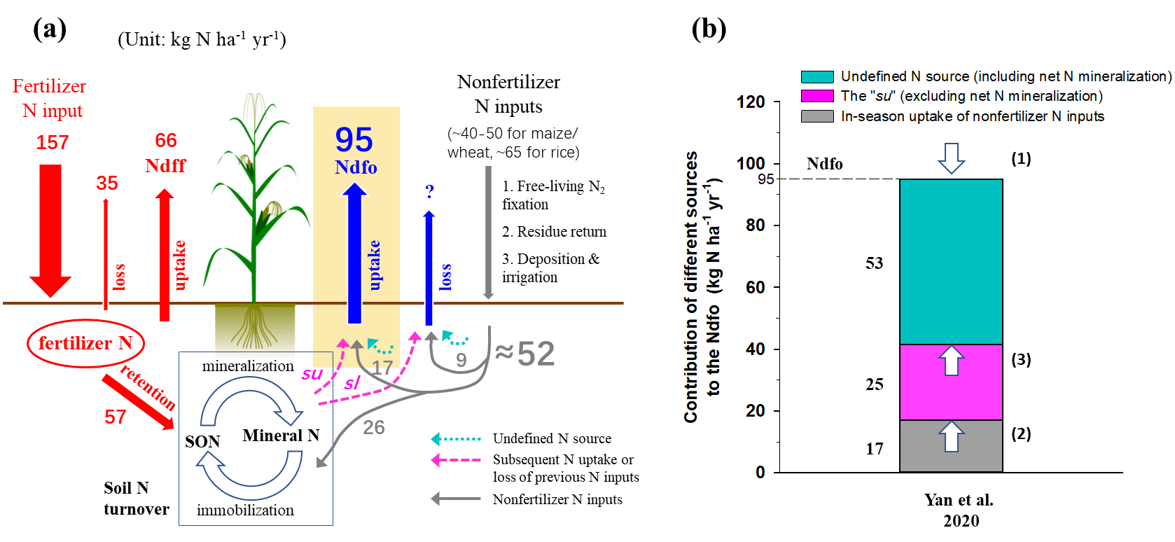 Yan等(2020)总结了全球的15N原位示踪试验数据,在Global Change Biology上撰文指出粮食作物吸收的氮素绝大部分来自其他氮源(Ndfo,平均95 kg N ha-1 yr-1)(图1a)。排除非肥料氮的投入和残效的贡献外,仍有相当数量未找到其来源(平均53 kg N ha-1 yr-1),因此Yan等(2020)猜测这部分未知氮源很可能是由土壤自身氮库提供(图1b)。我们重新分析了其数据,指出有以下几个原因可能导致了其在计算作物氮源的时候高估了未知氮源的贡献:1)15N微区试验和小区试验的作物产量相比普通农户更高,利用微区或者小区尺度的产量数据估算普通农户条件的情况,会高估15N的作物吸收、低估15N的土壤残留;2)Yan等(2020)的数据主要来自西方发达国家。西方发达国家秸秆还田率普遍较高,但其在统计氮平衡时却忽略秸秆还田的氮投入,从而低估了非肥料氮投入的总量和贡献;3)大部分15N示踪试验都是短期试验,短期15N回收并不能完全反映长期的15N回收,从而可能导致15N的后季吸收被低估(即使后季中的每一季都很低,也不意味着后季的累积贡献就很低)。