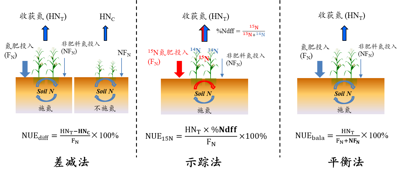 图1. 三种作物氮利用效率量化方法概念。FN和NFN分别指肥料氮投入和非肥料氮投入;HNT和HNC分别指施氮处理和不施氮处理的作物收获氮;Ndff和%Ndff分别指施氮处理作物氮吸收来自肥料的量和比例(通常指当季)。