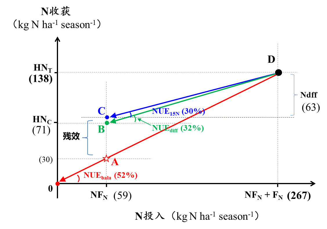 图2. 以我国粮食作物为例演示三种作物氮利用效率量化方法间的差异和联系。图中括号内数字为中国粮食作物系统的平均值。其中,肥料氮投入量(FN,208 kg N ha-1 season-1)、其他氮投入量(NFN,59 kg N ha-1 season-1)以及作物氮收获量(HNT,138 kg N ha-1 season-1)来自全国尺度的调查数据;而作物氮吸收中来自当季氮肥的比例(%Ndff,63/138 = 46%)和不施氮对照作物氮吸收量占施氮处理的比例(HNC/HNT,71/138 = 51%)则来自全国尺度的田间试验数据。经计算,中国粮食作物系统的NUEdiff,NUE15N,NUEbala分别为30%,32%和52%。