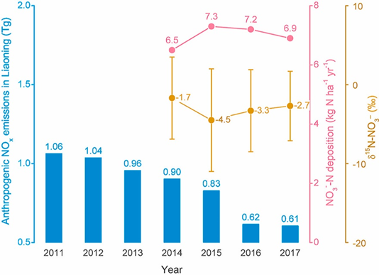 基于此,中国科学院沈阳应用生态研究所稳定同位素生态学团队在中国科学院清原森林生态系统观测研究站采集了2014-2017年间降水样品并测定了氮沉降量及硝态氮15N自然丰度。发现研究期间清原站大气硝态氮年均沉降量为7.0 kg N ha-1 yr-1, 占无机氮沉降量的1/3。2015年至2017年虽然辽宁省NOx排放量从0.83百万吨下降到0.61百万吨, 降幅为26%,但同期清原站大气硝酸盐沉降仅下降6%(图1)。不同年份之间大气硝态氮的15N自然丰度相差也不大(图1),其源解析结果表明清原站大气硝态氮的来源仍以人为源为主导(57%),人为源贡献也并未随时间出现下降的趋势,其原因机制还有待于进一步研究。该研究结果对于区域氮污染治理有一定的参考意义。