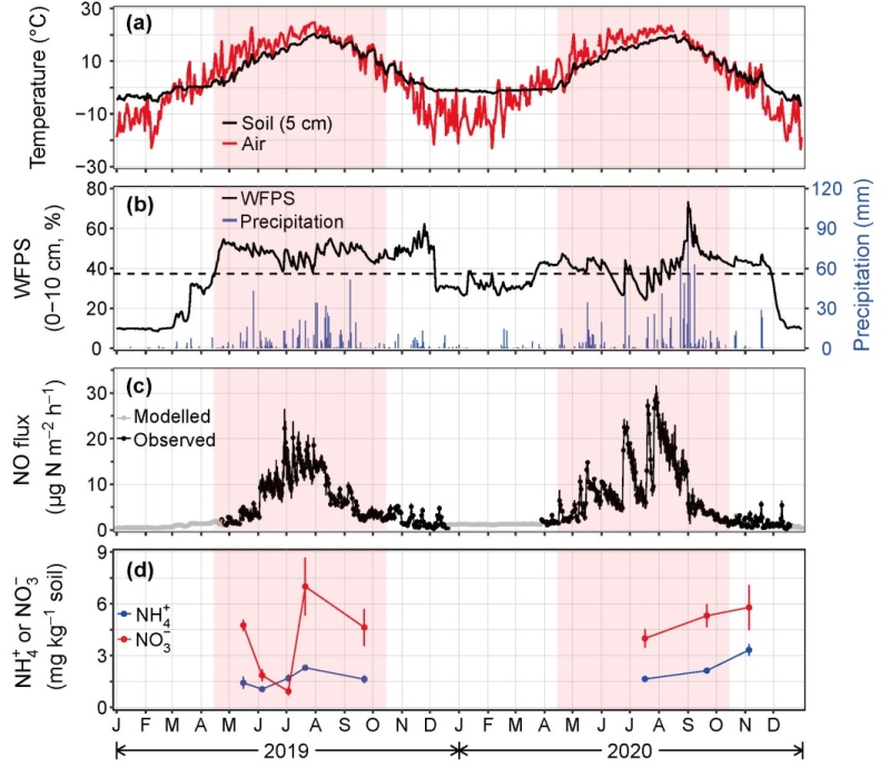 图2. 清原大气和土壤温度(a)、土壤湿度和日降水(b)、土壤NO排放(c)和土壤有效态氮含量(d)的季节动态