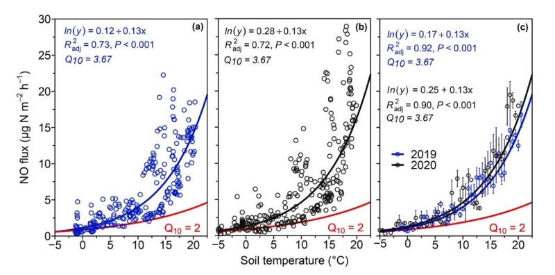 图a, b分别代表2019和2020年土壤NO排放与温度的相关性;图c代表取0.5 ℃的间隔后NO排放与温度的相关性