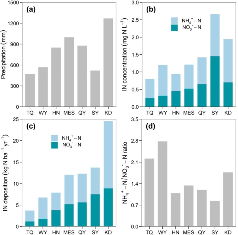 图1 . 东北区域7个森林站点(图强TQ,五营WY,桦南HN,帽儿山MES,清原QY,沈阳SY,宽甸KD,来自NECAD监测网络,稳定同位素组建立)2020年度降水量、降水样品中铵硝含量、氮沉降水平和铵硝组成比例