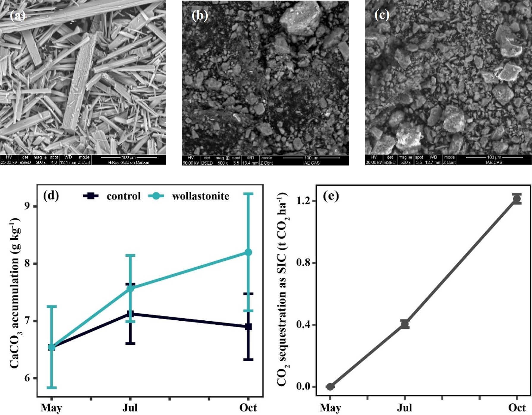 图2所使用的硅灰石粉(a)、水稻收获时硅灰石处理(b)和对照(c)土壤样品的扫描电镜图像和整个水稻生长过程中表层土壤无机碳积累(d)和硅灰石粉风化带来的CO2固持(e)