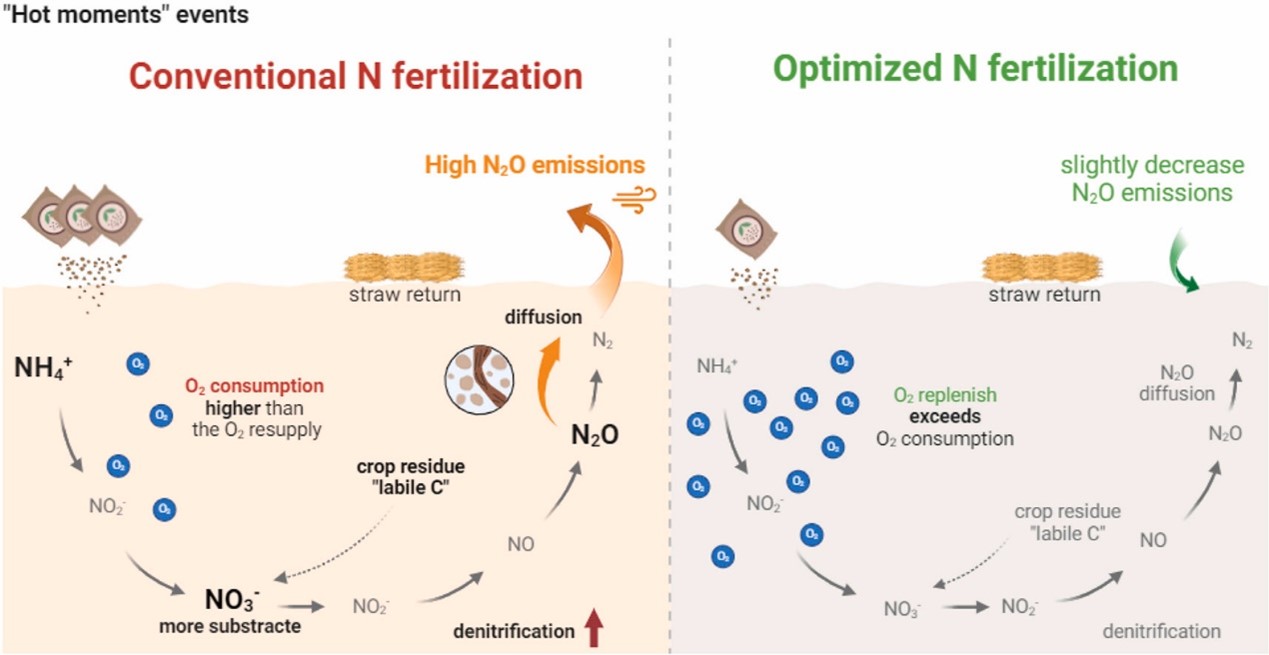 研究揭示了秸秆还田对土壤O2动态的“双重作用”:在瞬时微尺度上,秸秆还田加速了土壤O2的消耗;而在长期宏观尺度上,秸秆还田通过增加土壤孔隙度,改善土壤的通气状态。这一双重作用机制有效解释了秸秆还田对N2O排放的差异性影响,进一步强调了优化氮肥施用量对于减少农田土壤N2O排放的重要性。