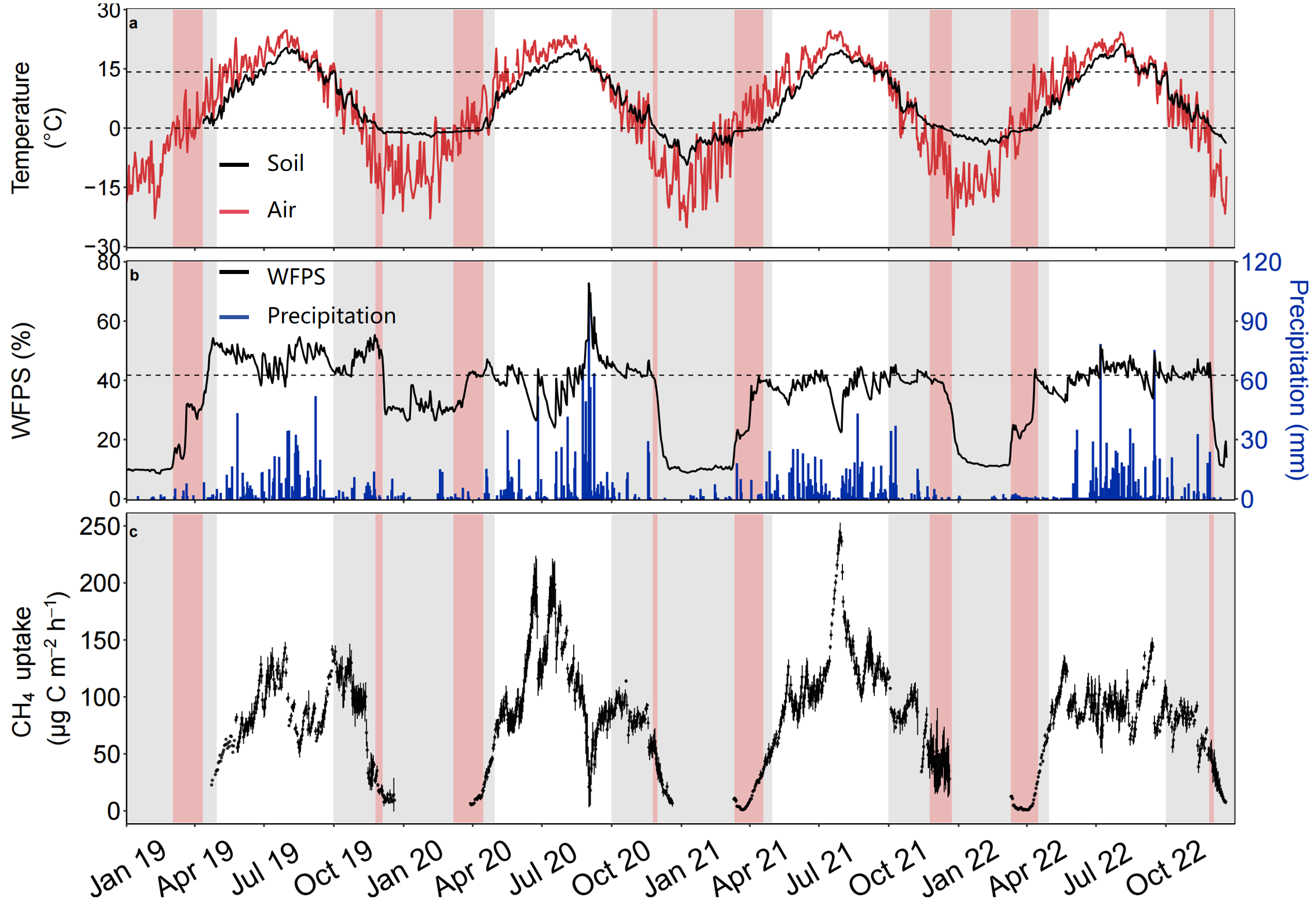 实验室在温带森林土壤吸收甲烷的温湿度双重调控机制研究取得新进展