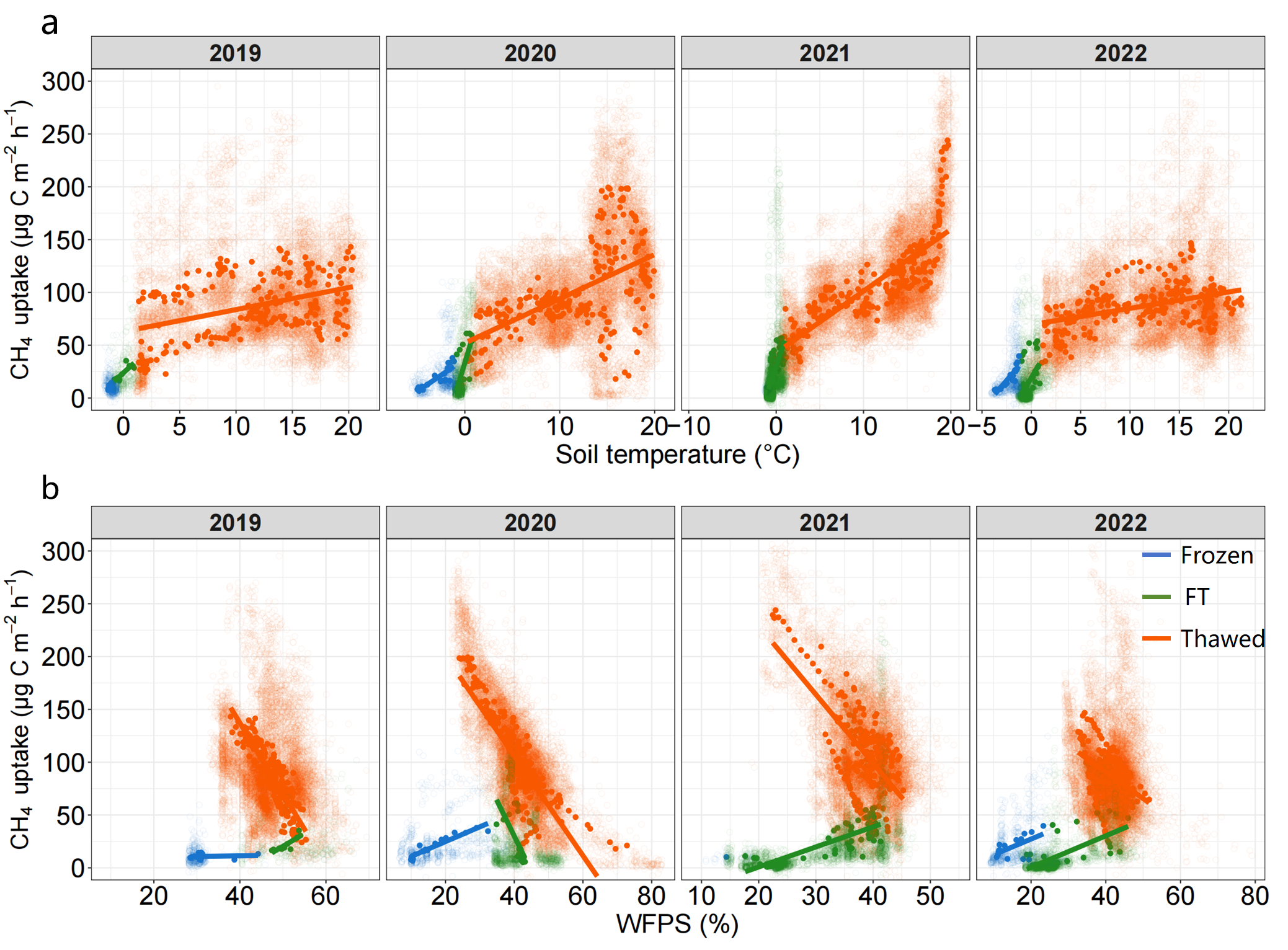 图2. 结冰(Frozen)、冻融交替(Freeze-Thaw Cycle)和非冻融时期(Thawed),CH4日吸收量与土壤温度(a)和土壤水分WFPS(b)的相关性
