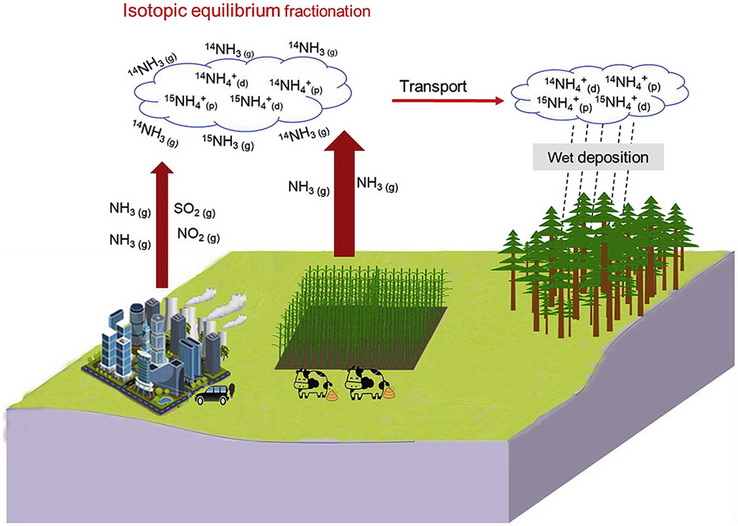 工业革命以来,人类活动向大气层排放的含氮化合物急剧增加,从而使大气氮沉降量随之急剧上升。过量氮沉降会对陆地生态系统产生一系列的影响,比如引起土壤酸化和养分失衡,水体富营养化,生物多样性降低等。大气氮沉降主要来自大气氨和氮氧化物排放。此外,大气沉降前体物质氨和氮氧化物在大气雾霾的形成中也扮演重要角色。中国是全球大气氮沉降严重的区域之一,为了减少大气氮沉降的不利影响,我国自“十二五”以来制定了氮氧化物减排的政策并实施氮氧化物总量控制,但是并未针对大气氨排放制定相应的减排政策。为了更好地制定大气氨减排的政策,了解大气铵沉降的氨源是十分重要的前提。近年稳定同位素测定技术的迅速发展使得氮同位素自然丰度来解析大气氨源成为可能。然而,过去诸多相关研究主要集中在氮污染严重区域(城市和农业区域),在偏远相对洁净的地区研究少。而且,同位素源解析的研究往往忽略了铵盐形成过程中的分馏作用(图1)。