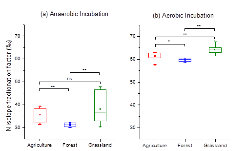 中国科学院沈阳应用生态研究所稳定性同位素生态学研究团队,采集了中国北方三种生态系统类型共七个站点的土壤样品(两个农田土,两个森林土和三个草地土壤),进行了室内控制培养实验, 分别测定其在有氧和厌氧条件下产生的NO及底物硝态氮和铵态氮氮同位素组成的变化,并探讨了硝化和反硝化作用产生NO过程中的同位素分馏作用。研究结果发现,有氧条件(硝化作用占主导)土壤产生的δ15N-NO(-56 ± 4‰)显著低于厌氧条件(反硝化作用主导)产生的δ15N-NO(-33 ± 7‰,图1)。此外,不同生态系统类型土壤均表现为有氧过程产生NO的分馏系数(61 ± 3‰)显著大于厌氧过程产生的分馏系数(35 ± 6‰,图2)。而且,不同的土壤类型之间,产生的NO的过程的同位素分馏作用差异不大(图2)。因此,可以根据土壤产生的δ15N-NO值来区分硝化和反硝化作用对土壤NO产生的相对贡献,为建立N循环模型提供理论基础。我们还发现,土壤产生的δ15N-NO值(-62 ~ -23‰)显著低于生物质和化石燃料燃烧产生的δ15N-NO(0 ~ + 20‰,图1)。因此,利用氮稳定同位素技术可以有效区分土壤和人为源对大气NO的贡献。