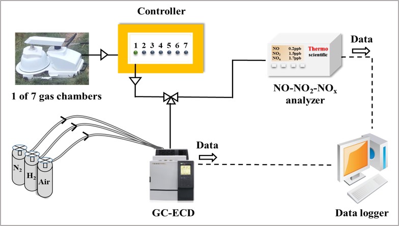 农田土壤是大气氧化亚氮(N2O)和一氧化氮(NO)的重要排放源。其中N2O是重要的温室气体,也是破坏平流层臭氧的重要底物;而NO化学活性强,极易被对流层臭氧和氢氧自由基氧化,是大气细颗粒物中硝酸盐形成的前体物质。农田大量氮肥的施用增加了土壤N2O和NO的排放。东北地区是我国重要的粮食产区之一,该区域60%以上的农田为旱地。前期研究报道该区域农田氮肥利用率不足40%,约20%的氮肥可能通过气态氮的形式损失,但对各含氮气体的损失量、排放的时空动态规律和控制因子仍缺乏了解。此外,目前开展的土壤NO和N2O排放速率原位观测的研究站点十分有限,且主要采用人工间歇式手动采样法,这种低频率采样不仅忽略了各气体排放的日变化规律,还会错过短时间内的脉冲排放事件(如降雨、灌溉和施肥等),导致气态氮损失的量化具有很大不确定性。