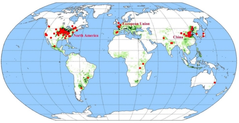基于此,中国科学院沈阳应用生态研究所稳定同位素生态学研究组与美国马里兰大学环境科学研究中心阿巴拉契亚实验室合作,收集了全球74篇利用15N田间原位示踪法量化玉米农田肥料氮去向的文献(图1),从中提取了366个观测数据,系统分析比较了常规耕作条件下氮肥利用率和氮肥去向的地区间差异,并进一步分析了不同农田管理措施的影响。研究发现,施入玉米系统的当季氮肥全球平均有41%被作物吸收利用,31%残留在土壤,28%损失掉(进入水体和大气)。其中作物吸收利用表现出明显的地域差异,欧美国家的吸收比例(42-54%)要显著高于中国( 33%)(图2)。相关分析表明,中国玉米农田氮利用效率较低可能与该地区较低的土壤有机质含量有关。通过对比9种不同的农田管理措施对氮肥去向的影响,发现氮肥深施和多次施用可显著增加玉米产量、氮吸收和氮肥利用率,并减少损失。该研究系统总结了以往15N示踪玉米农田肥料氮去向方面的研究结果,增加了人们对有关不同自然和农田管理条件下氮肥去向差异的理解,为提升农田氮肥管理提供了科学依据。