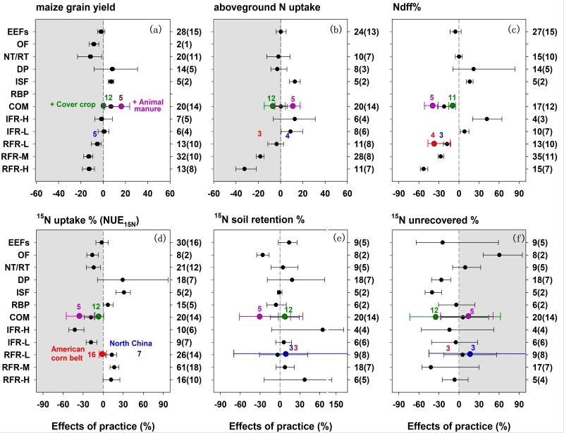 图3. 不同农田管理措施对玉米产量、氮吸收、肥料氮贡献比例(%Ndff)以及农田肥料氮去向(15N uptake、15N soil retention、15N unrecovered)的影响