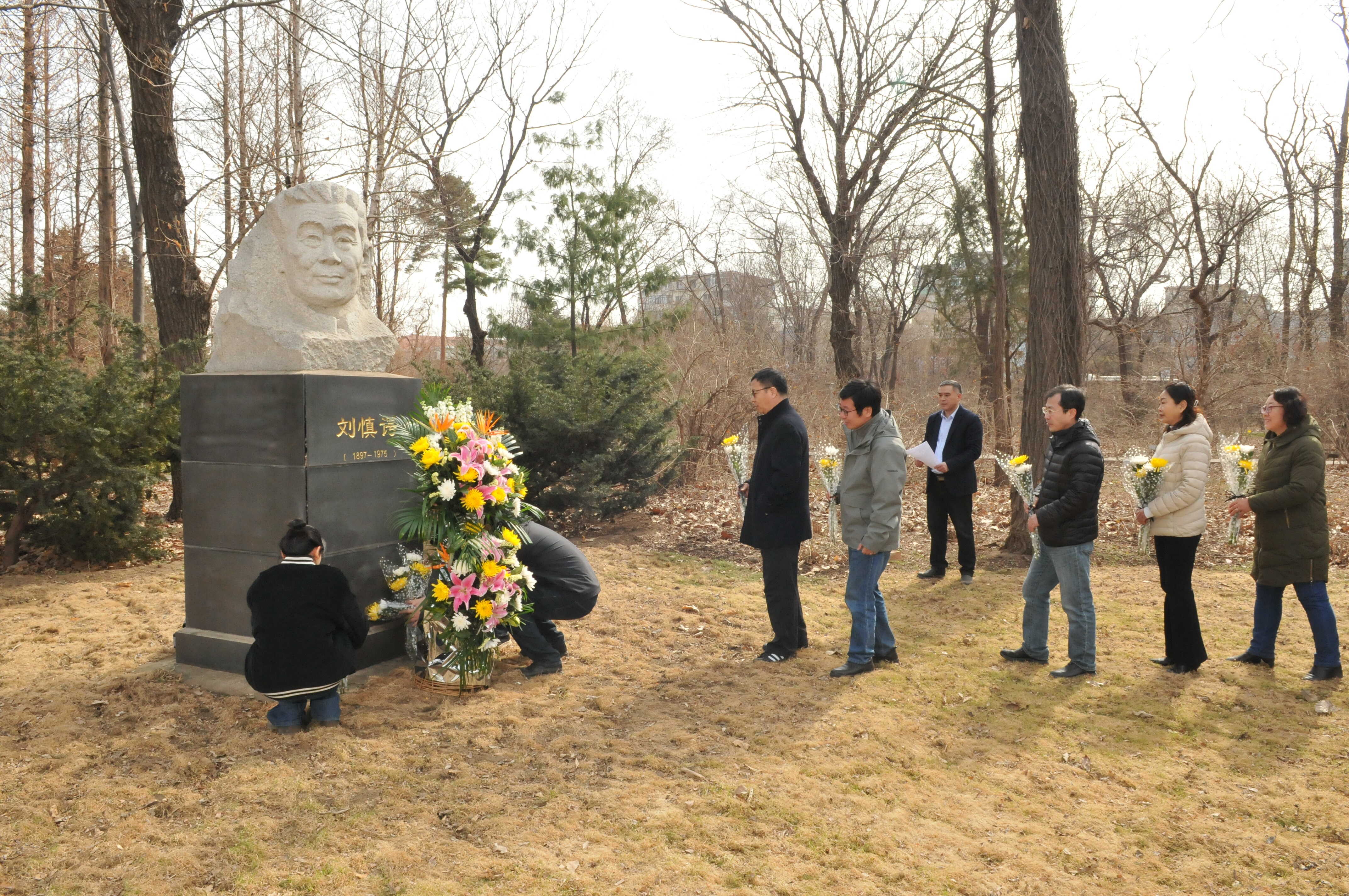 党委副书记、纪委书记郝欣和树木园主任何兴元研究员向刘慎谔先生雕像敬献花篮